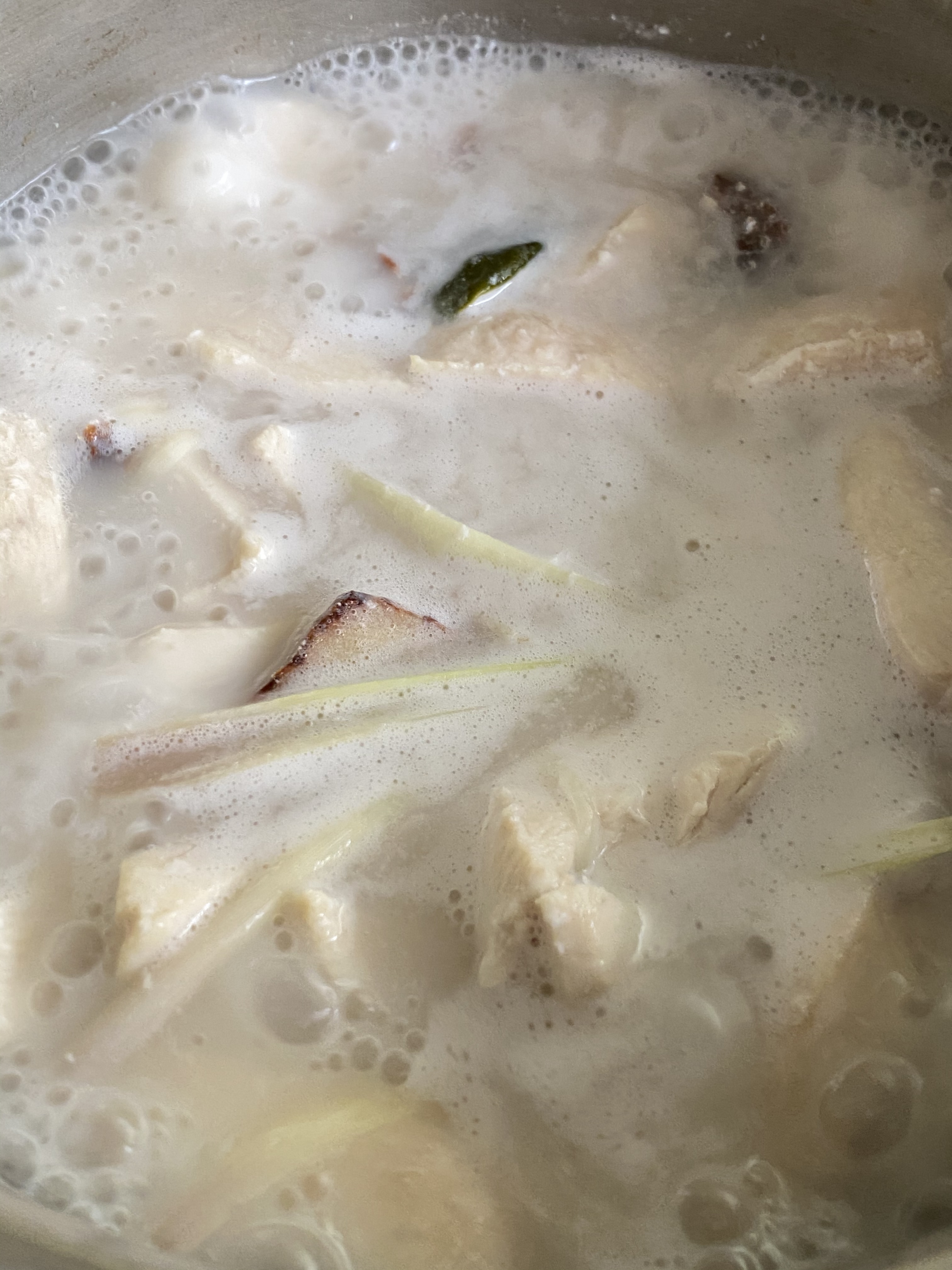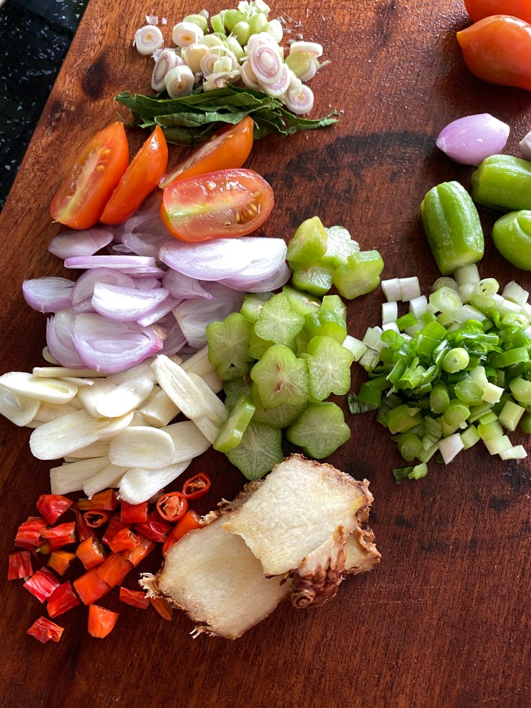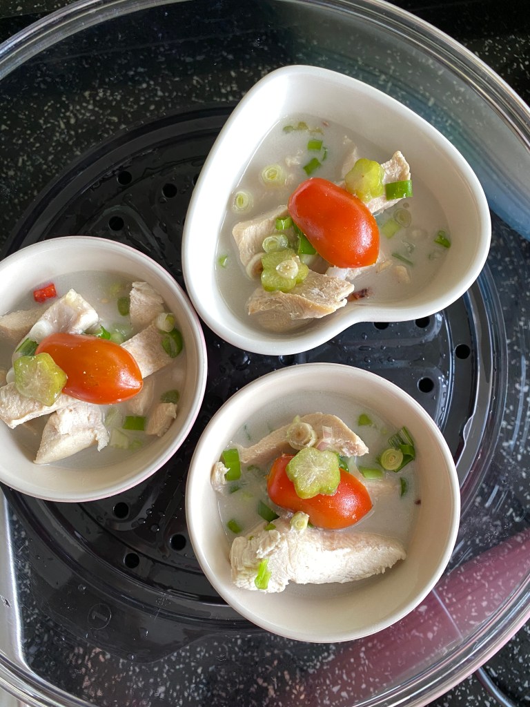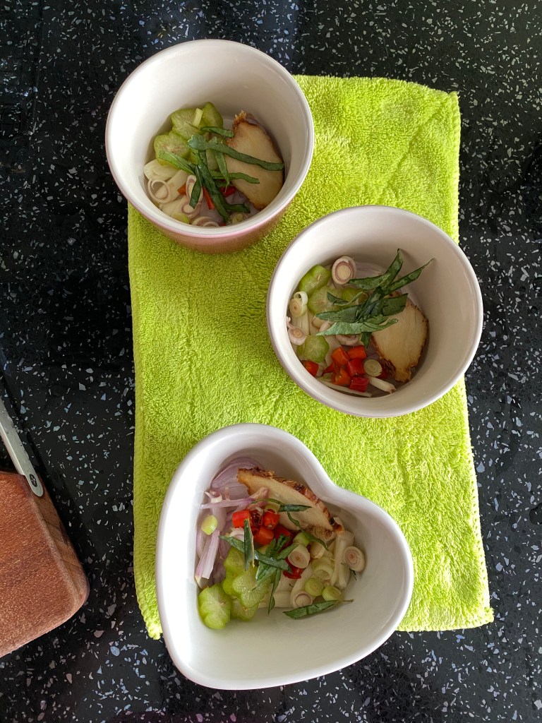 Yummy!Javanese Garang Asem in ramekin (traditionally wrapped in banana leaf)Three ramekins of garang asem ready to steamBoiled chicken added to ramekin, coconut milk add the lastSliced herbs and spices arranged in ramekinChicken boiled in lemongrass, kefir lime leaf, galangal, sugar (if you wish), salt, coconut milkCleaned and sliced