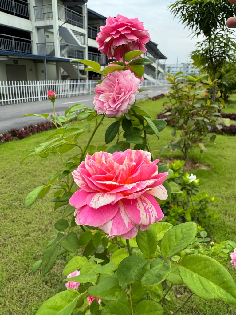 from a stem of orchids protruding through the balcony trellis