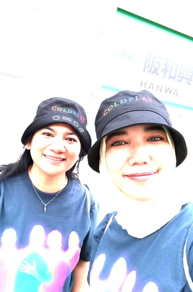Another coincidence. My friend and I didn’t say anything about which tee to wear yet both of us happened to wear the same one: Coldplay 2023 Tokyo special edition design. Wow!