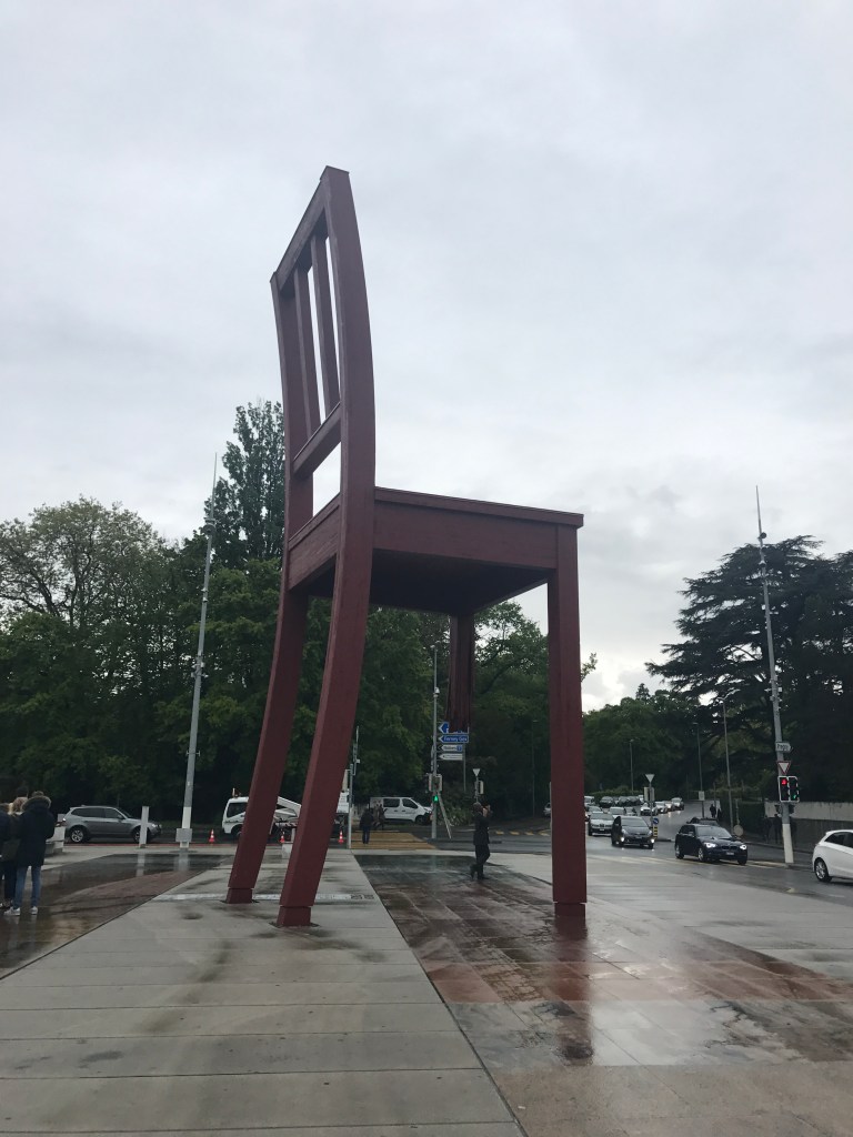Broken Chair stands in delicate balance on three legs – the fourth having been violently blown off as if by an explosive charge. A way of showing that even mutilated, victims of warviolence are still standing tall, with dignity. (www.unadap.org)to me “Broken Chair” is also a question “can’t people sit down together and talk instead of defeating others in ignorance?” the saddest symbol I’ve seen