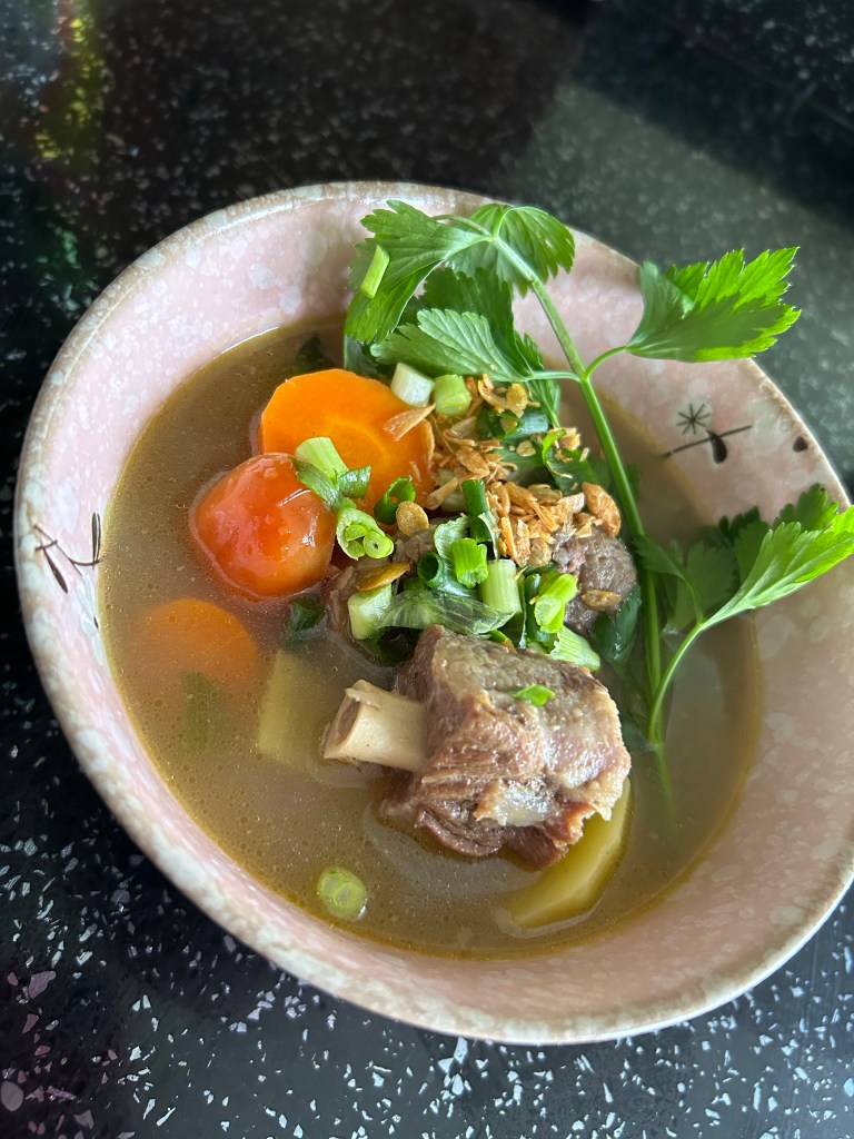 rain stopped when i reached home (with my keys) but the cold was wrapping my wet body — after some light shower, i decided to cook my favourite oxtail soup (lucky i boiled the oxtail this morning – i am blessed with every luck)