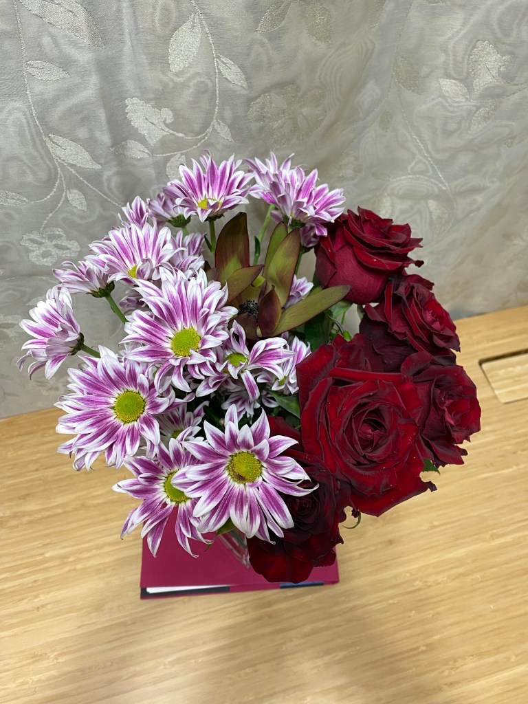 the pink striped daisies stay longer than predicted, red roses come to sit together ⭐️