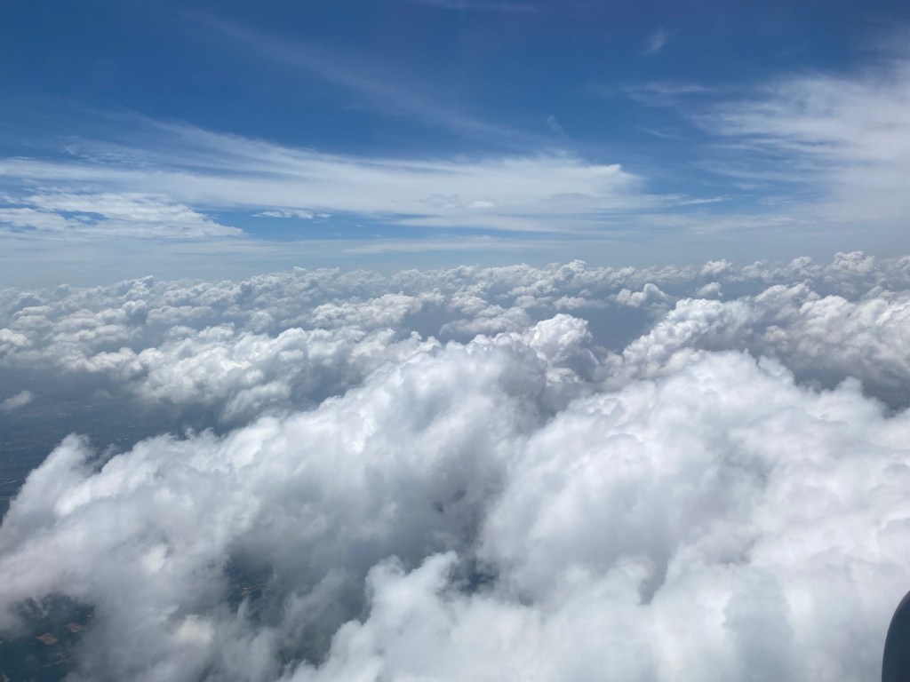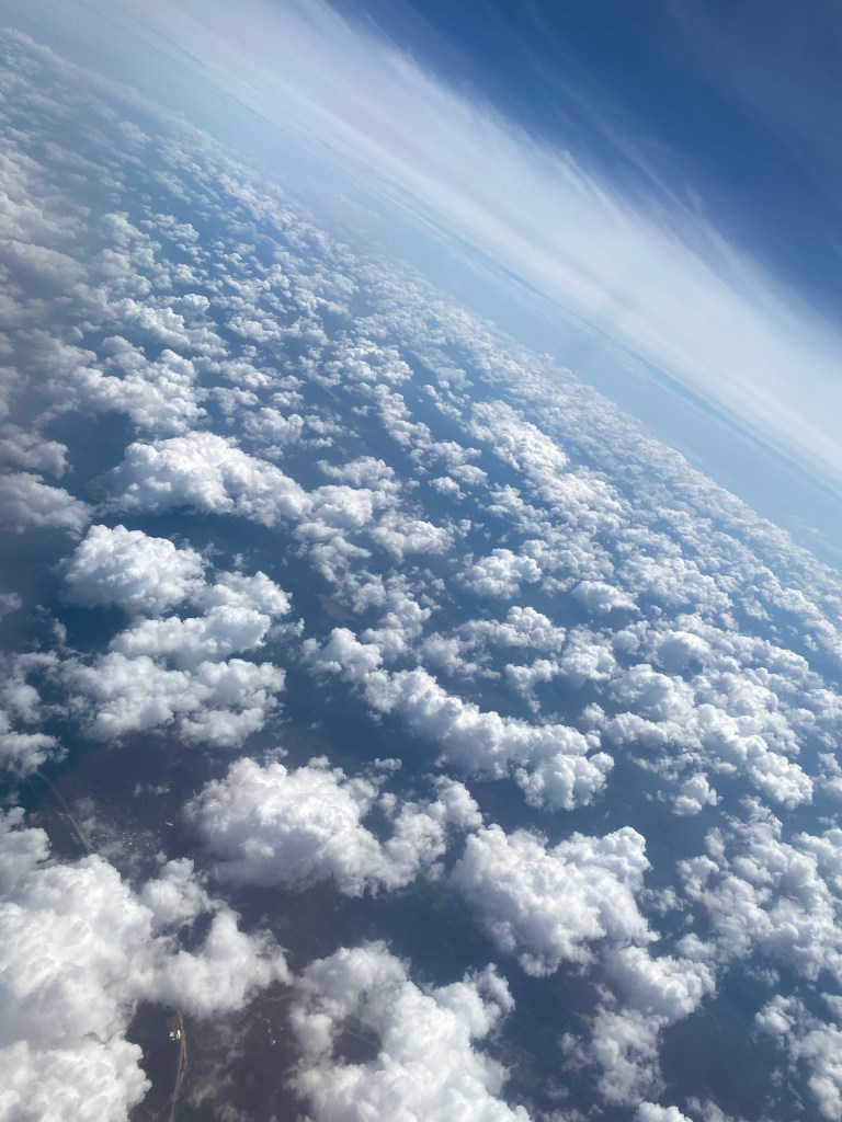 Looking for one face behind the cloud, I meet a smiling sky whispering "Land and meet one while your feet are on the ground."